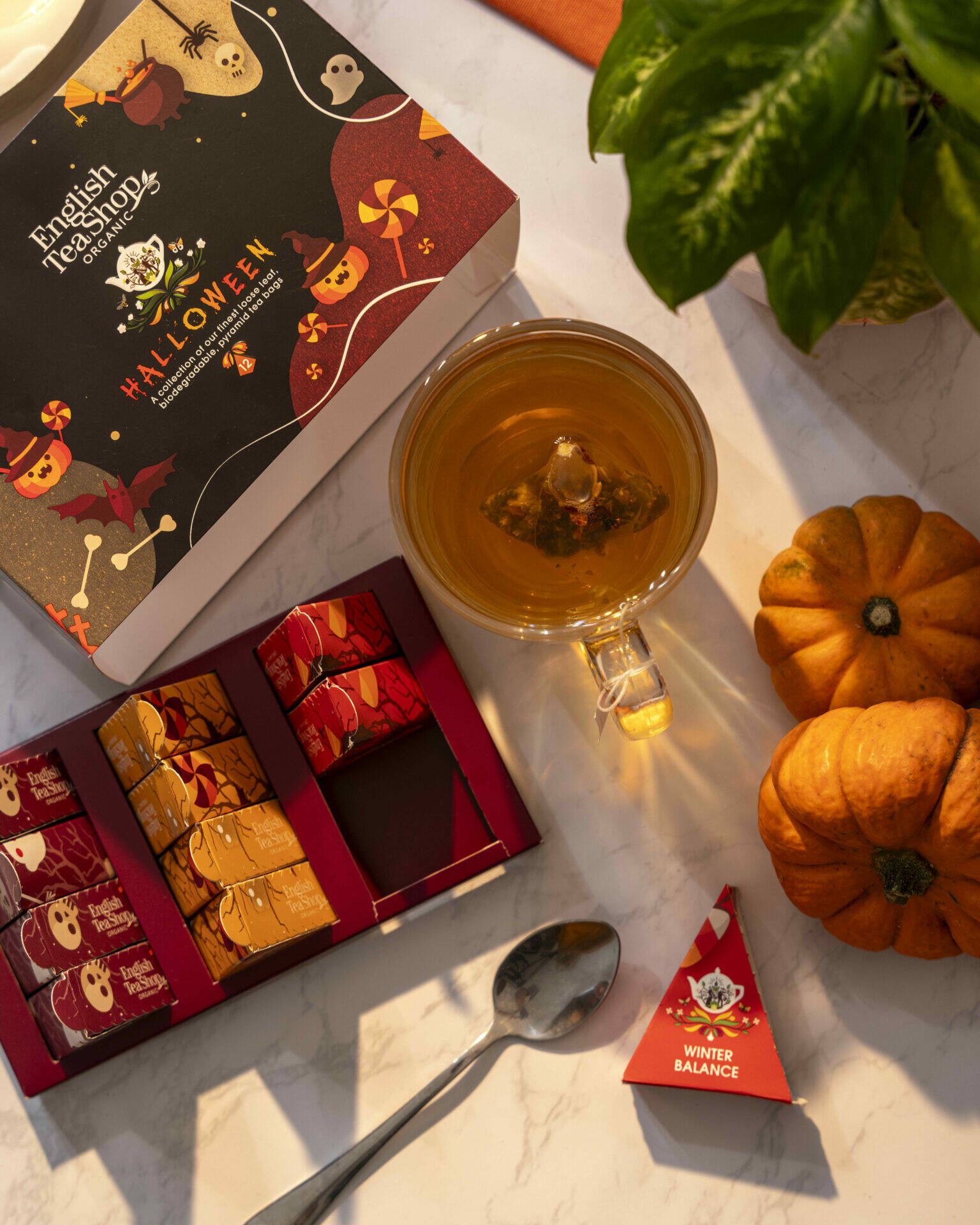 This wickedly delicious Halloween selection comes with the 12 organic pyramid tea bags encased in mini wedge-shaped decorated boxes. The wedges sit in a pull-out tray inside a sleeve also decorated with pumpkins, cauldrons, spiders, bats and ghosts.