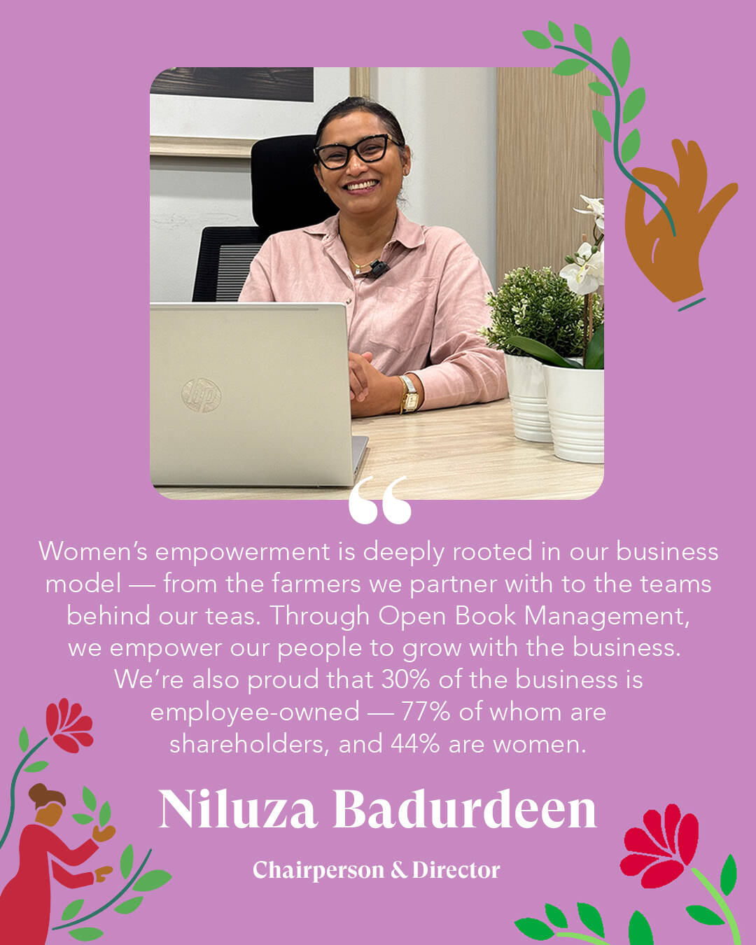Niluza Badurdeen is a true inspiration and trailblazer at English Tea Shop. From the very beginning, she has championed strategic and sustainable initiatives that have shaped the company’s founding purpose and its “Prajãva” (community) philosophy, creating meaningful impact across the organisation.